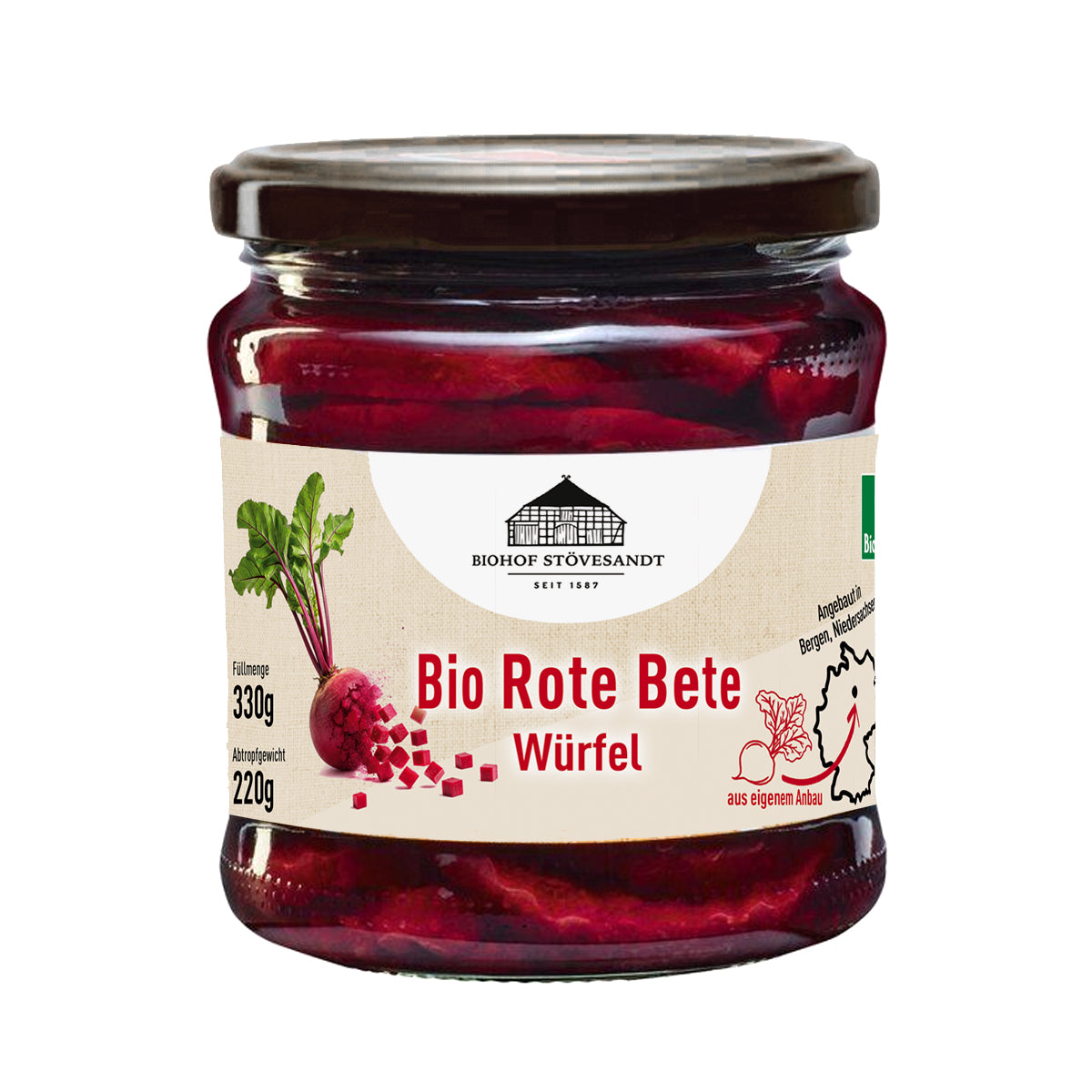 Rote Bete Würfel – Fix und fertig, fein gewürzt.Wir lieben frische Rote Bete – aber manchmal fehlt im Alltag einfach die Zeit für die Zubereitung. Genau dafür gibt es unsere Bio Rote Bete Würfel. Damit hast du die gewohnte Qualität immer griffbereit im Vorratsschrank. Die Rüben wachsen direkt in Bergen auf unseren Feldern, werden erntefrisch verarbeitet und kommen fertig gewürfelt ins Glas. Im Gegensatz zur frischen Knolle, die du nach Belieben selbst würzen kannst, haben wir hier die Arbeit schon erledigt. Die Würfel sind in einem feinen Sud aus Branntweinessig, etwas Rübenzucker und Meersalz eingelegt. Für das gewisse Etwas sorgen klassische Gewürze: Kümmel und Nelke. Das schmeckt herrlich mild, süß-säuerlich und schön traditionell. Warum das Glas in deinen Vorrat gehört:
