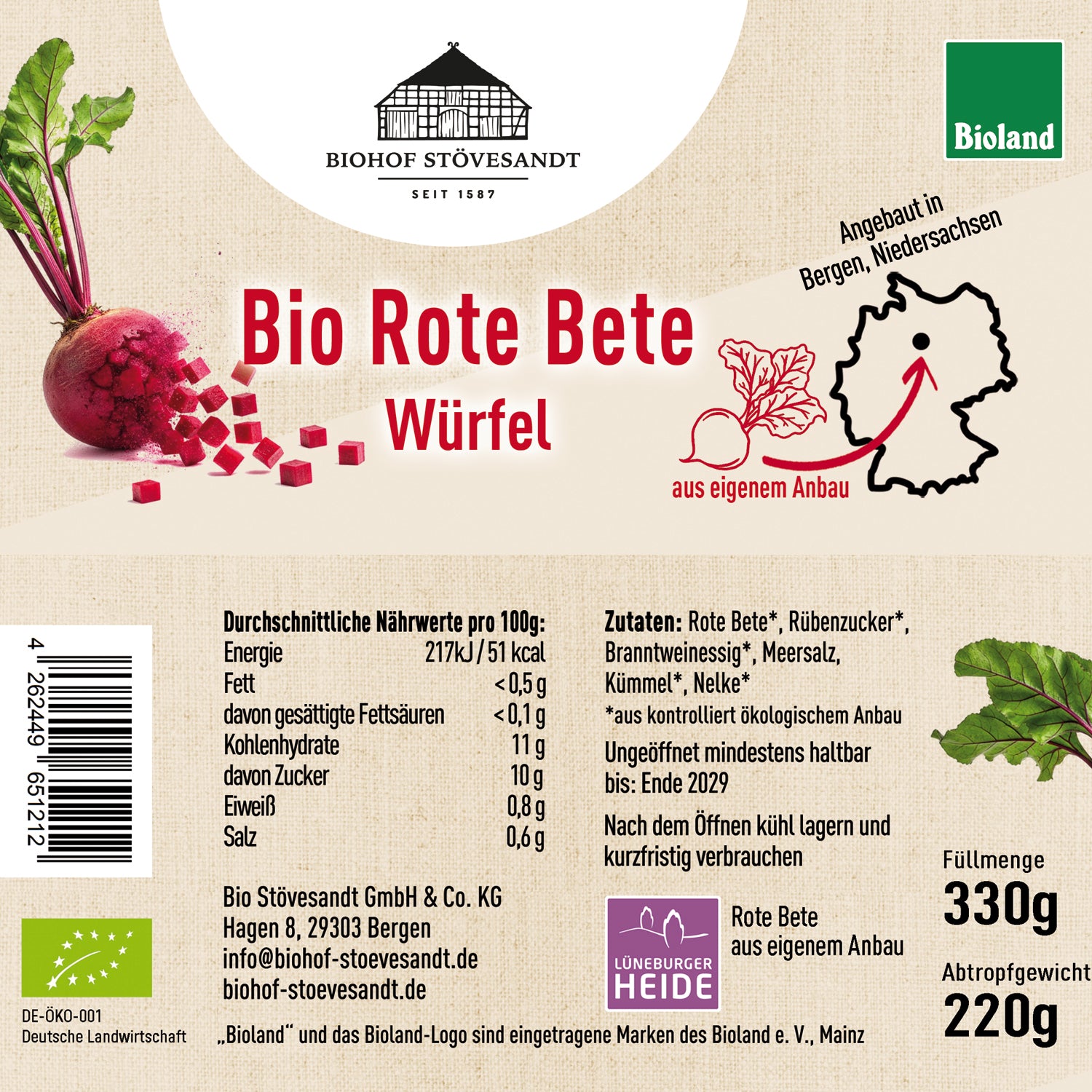 Was ist drin? Ehrliche Zutaten, ganz transparent. Rote Bete, Wasser, Essig, Zucker und Gewürze. Natürlich haltbar gemacht, ohne künstliche Konservierungsstoffe. Daten & Fakten: