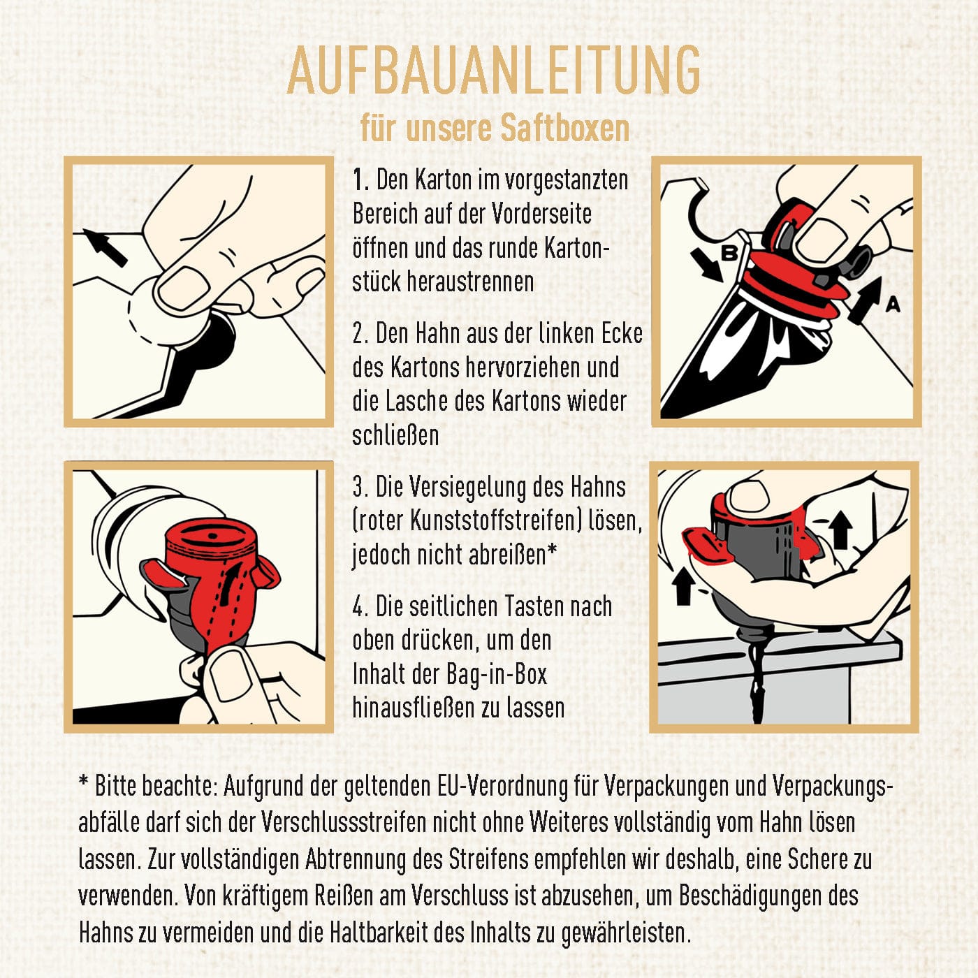 Haltbarkeit nach Anbruch der Bag-in-BoxDas Bag-in-Box-System ermöglicht eine Haltbarkeit des Inhalts von 2 Monaten nach Anbruch. Grundlage dafür ist, dass der luftundurchlässige Hahn den Inhalt vor Kontakt mit der Außenluft schützt. Um die Dichtheit des Hahns zu gewährleisten, ist die Box nach Anbruch ausschließlich aufrecht stehend zu lagern. Gleichzeitig empfehlen wir, den Saft vor dem Zapfen zu schwenken, um einem Verstopfen des Hahns vorzubeugen. Ein übermäßiges Schütteln hingegen ist nach Anbruch zu vermeiden. Sobald am Auslasshahn kein Saft anliegt, kann Luft in das Produkt gelangen und einen Gärungsprozess in Gang setzen. |
